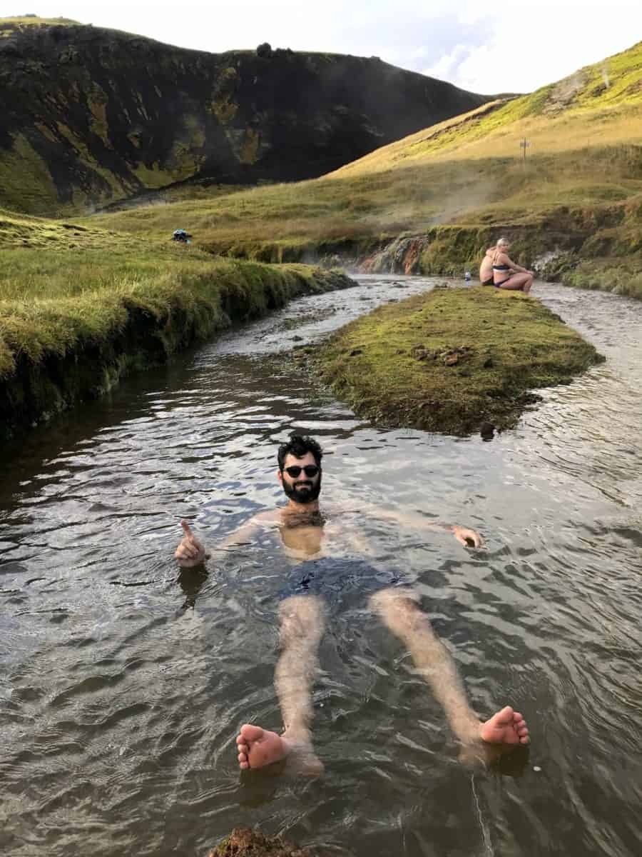 First stop: getting our dip on. The Blue Lagoon was fully booked during our trip (call ahead! We did not), so we went to the cooler (hotter) version, the Reykjadalur Hot Spring in the Golden Circle. A 4 km hike in to a steaming bath of spring water and friendly tourists, with some hot mud pools and Lord of the Rings scenery along the way. Pro tip – don’t go into the unmarked 100° Celsius bubbling mud pit, or you’ll burn your feet (“learning by doing” is our unfortunate motto).