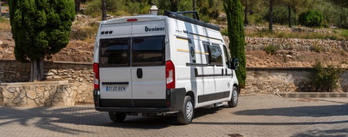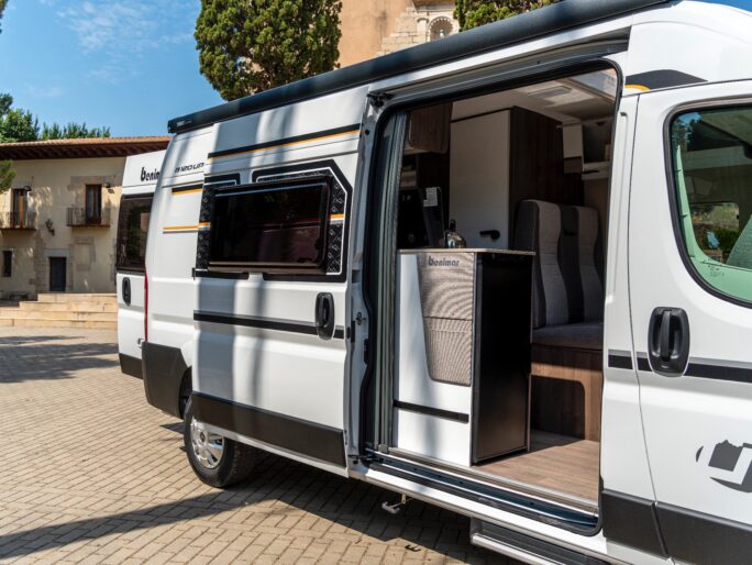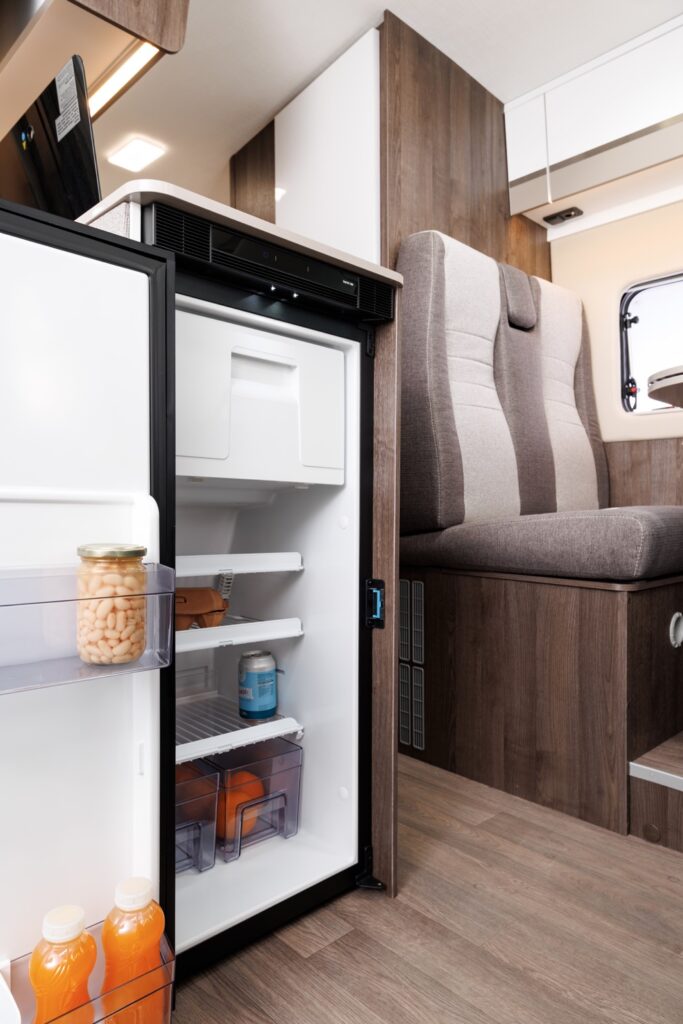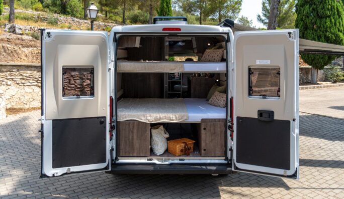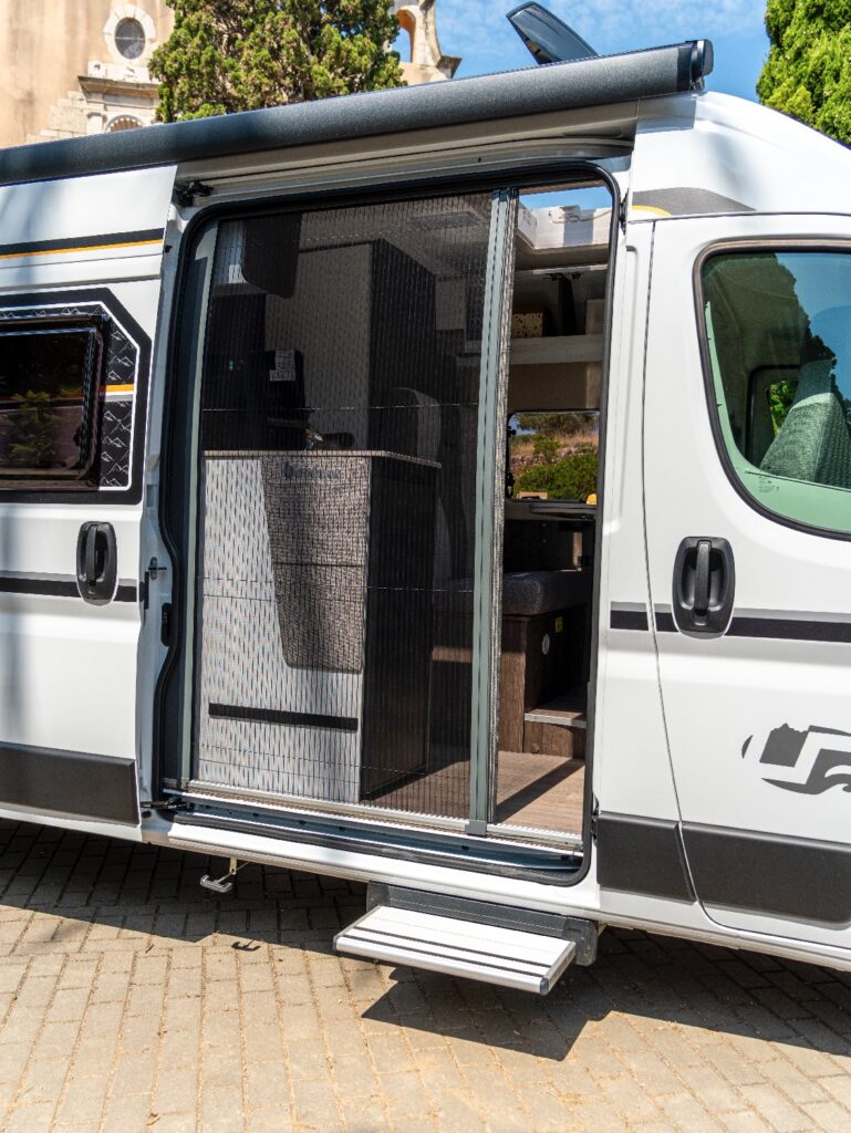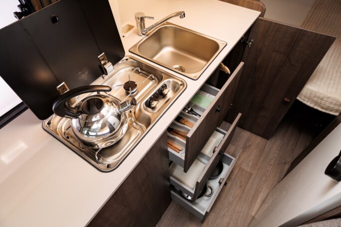 The van has a built-in auxiliary battery that powers the standard 12v functions and the option for 230v campsite plug-in.