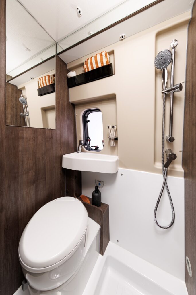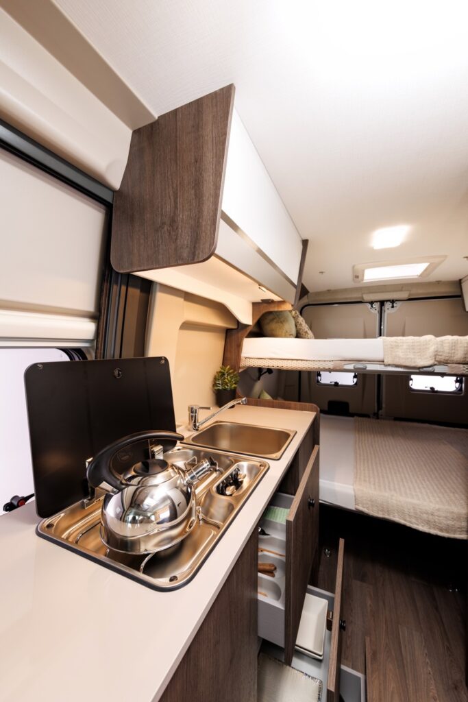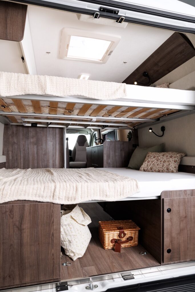 In the Motorhome 4, there is a WC with a shower and double bunk beds that fit 4 comfortably.